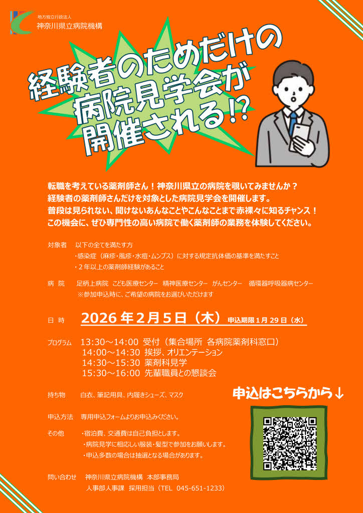 2年以上の薬剤師経験のある方向けの病院見学会が令和8年2月5日(木)に開催されます。ぜひご参加ください。