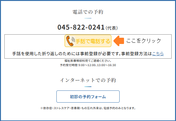1. 電話番号の下にある手話で電話するボタンをクリックしてください。